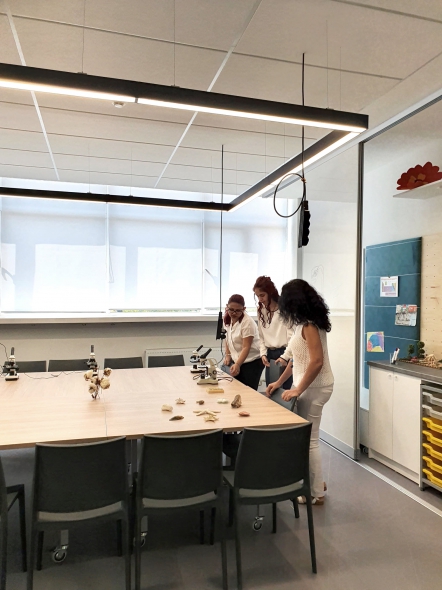 Продължаваме с лаборатория „ Еврика “ , където ще се организират часовете по биология, химия и физика. Оборудвано пространство с умивалници, работни плотове и лабораторна камина, а специфични контакти от тавана поддържат свободното пренареждане на масите и обезпечаването на зареждане на което и да е място. Следва зона „ Сътворение “, естествено продължение на лаборатория „ Еврика “. Двете помощения могат да се употребяват дружно или поотделно. Тук обзавеждането е с самостоятелни модулни маси, които са леки и устойчиви и могат да се пренареждат във всевъзможни форми. Зоната предлага и дребен ъгъл с амфитеатър, като вторична зона за представяне с изключение на сцената в „ Сърцето “, където могат да се репетират презентации пред по-малка аудитория.