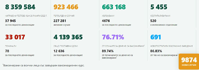 9874, с 42 случая по-малко от през вчерашния ден, са новодиагностицираните с COVID-19 лица у нас за миналите 24 часа. Това са 26,02% от тестваните. За последното денонощие са направени общо 37 945 теста, 13 229 от които PCR, а 24716 - антигенни. Това сочат данните в Националната осведомителна система.