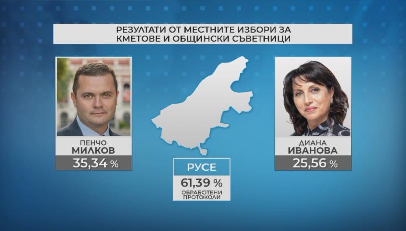 А резултатите в Русе до момента демонстрират, че Пенчо Милков от Българска социалистическа партия и Диана Иванова от ГЕРБ отиват на втори тур на изборите.