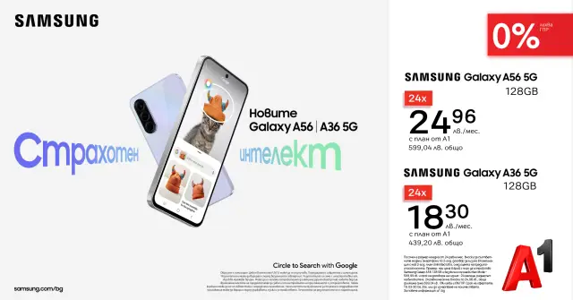 А1 разгласи старта на продажбите на най-новите модели от известната Galaxy A серия на Samsung – Samsung Galaxy A26 5G, Samsung Galaxy A36 5G и Samsung Galaxy A56 5G. До 30 април всички устройства могат да бъдат закупени с 0% рента на лизинг за 24 месеца с проект Unlimited и в комплект с безжични слушалки ttec Mode. Тази оферта дава опция на потребителите да се насладят на висока продуктивност, качествени камери и дълготрайни акумулатори, съчетани с интелигентни технологии, които улесняват всекидневието.