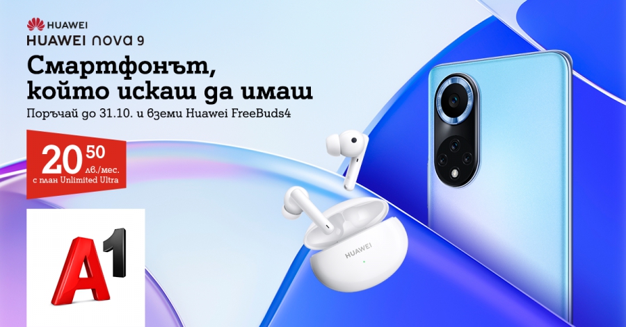 А1 приема предварителни поръчки за новия модел на Huawei – nova 9. Смартфонът може да бъде деклариран онлайн от уеб страницата на телекома до 31 октомври, когато стартират и неговите доставки, a поръчалите авансово ще го получат в комплект с новите безжични open-fit слушалки Huawei FreeBuds 4. Nova 9 се предлага в брой или на погашение с мобилните проекти на А1.