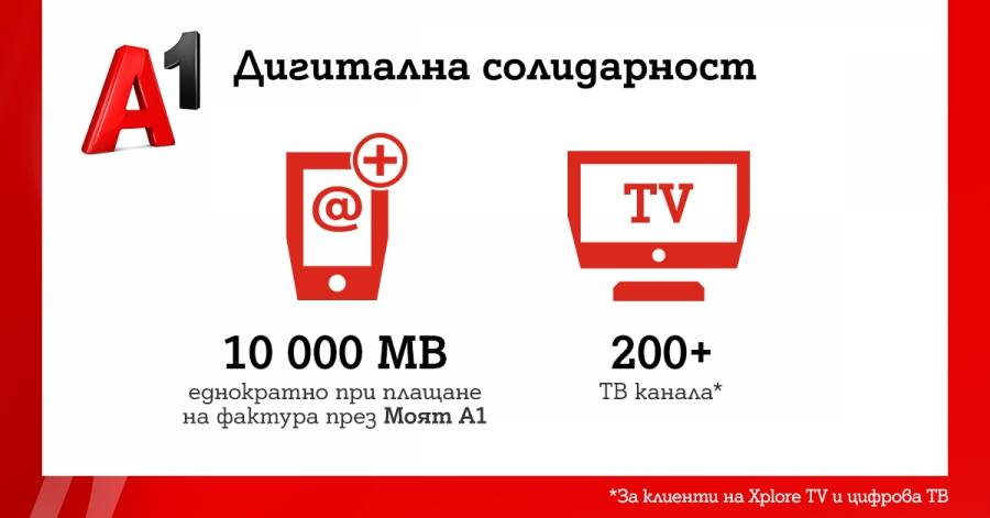 А1 продължава да оказва помощ на своите клиенти да се оправят с интервала на обществена изолираност по време на пандемията от COVID-19 и удължава периодите на оповестените през март начинания за цифрова взаимност. До края на изключителното състояние у нас – 13 май, клиентите на Xplore TV и цифрова телевизия от А1 ще имат свободен достъп до 200+ ТВ канала. До 31 май А1 ще дава и еднократен бонус от 10 000 МВ мобилен интернет на оптималната скорост при платена сметка през мобилното приложение Моят А1 или портала Моят А1 на A1.bg. Клиентите могат да разчитат на А1 за обезпечаването на безвъзмезден трафик до платформата Уча.се до 30 април.