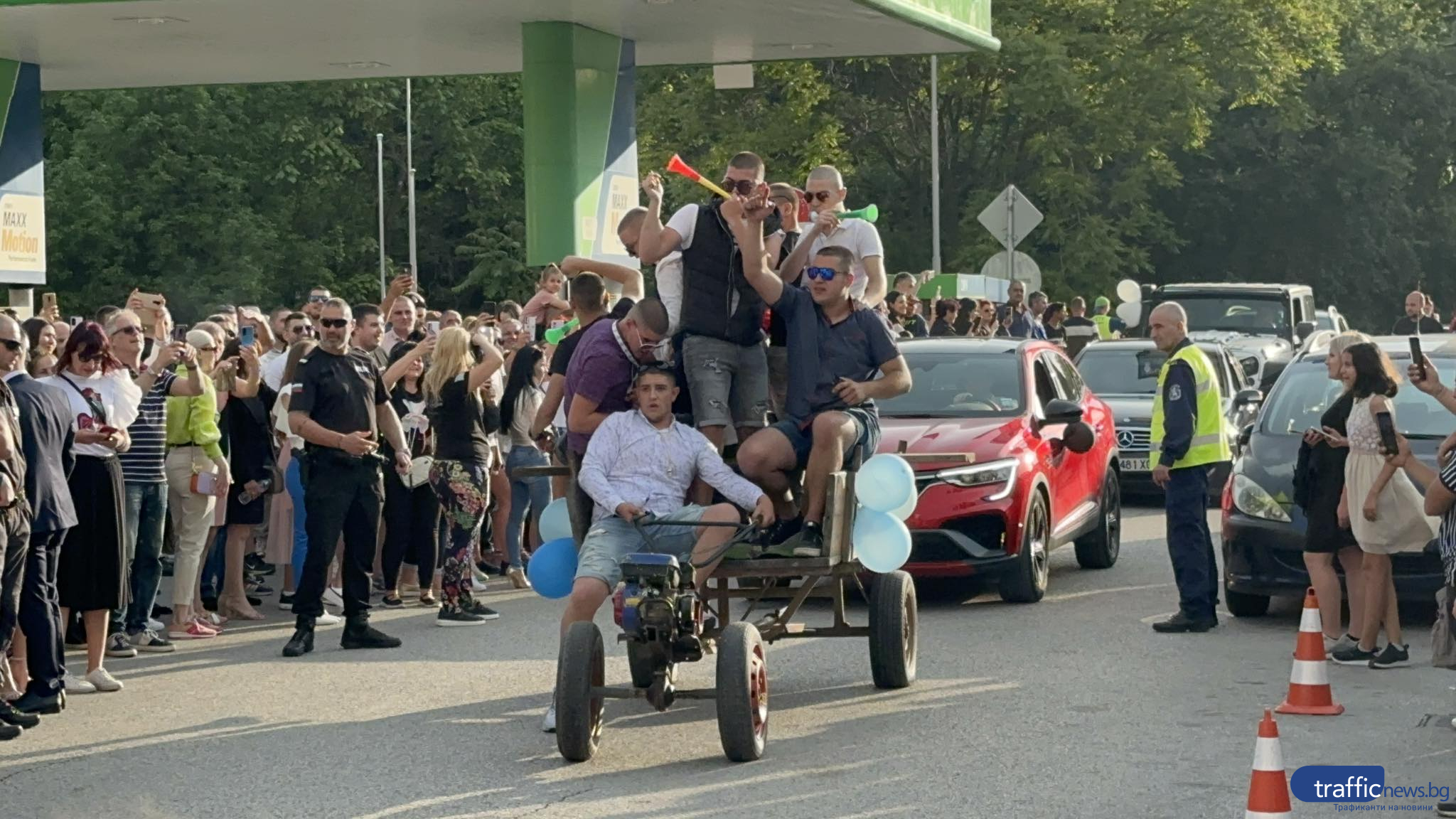 Абитуриенти впечатлиха с забавен избор на транспортни средства пред хотел „ Санкт Петербург ”. Днес там завършването си ще честват учениците от ПГ по облекло “Ана Май ”, ПГХТТ и ПГ по механотехника “Проф. Цв. Лазаров ”.