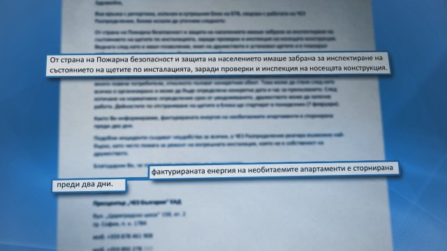 В писмо до bTV от ЧЕЗ декларират: „ Oт страна на Пожарна сигурност и отбрана на популацията имаше възбрана за ревизиране на положението на вредите по инсталацията, поради инспекции и ревизия на носещата структура. Фактурираната сила на необитаемите жилища е сторнирана преди два дни.