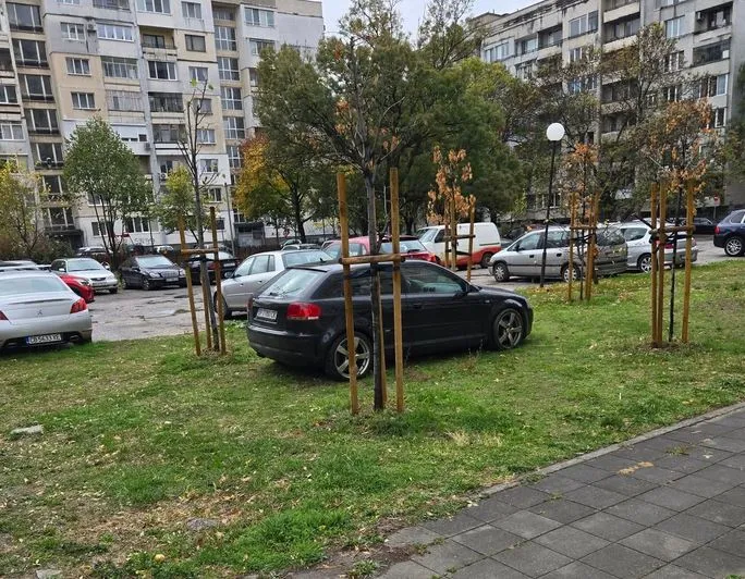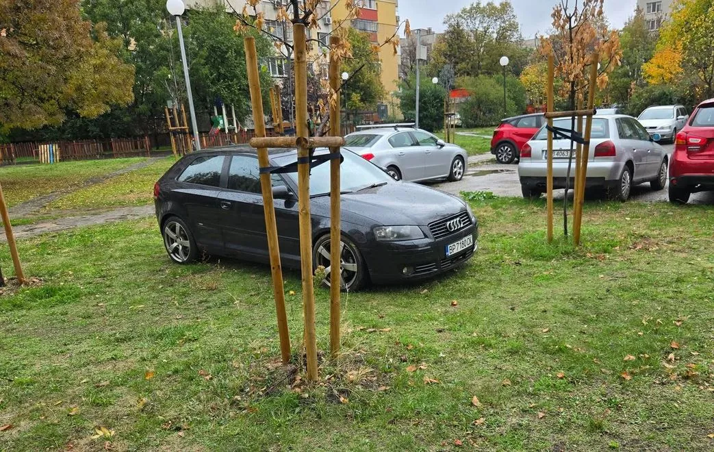 Абсурдно паркиране на лидер с черно „ Ауди “ повдигна един безконечен софийски въпрос, който трови нервите и на водачи, и на пешеходци. Малкият хечбек се е намърдал на полянка сред няколко новозасадени фиданки, грижливо оградени с колчета.