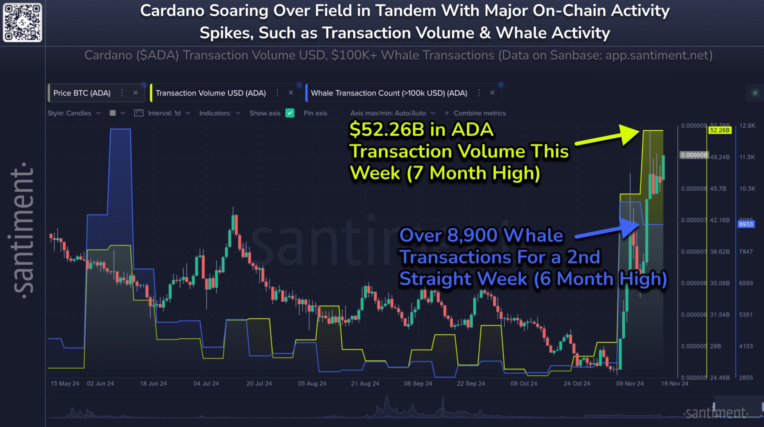 Обемите на транзакциите и интензивността на китовете доближиха равнища, които не са следени от юни, интервал, който предшестваше забележителен скок в съотношението на ADA към BTC. С тази възходяща инерция някои считат, че ADA може да основава предпоставки за още по-големи ценови придвижвания в бъдеще.