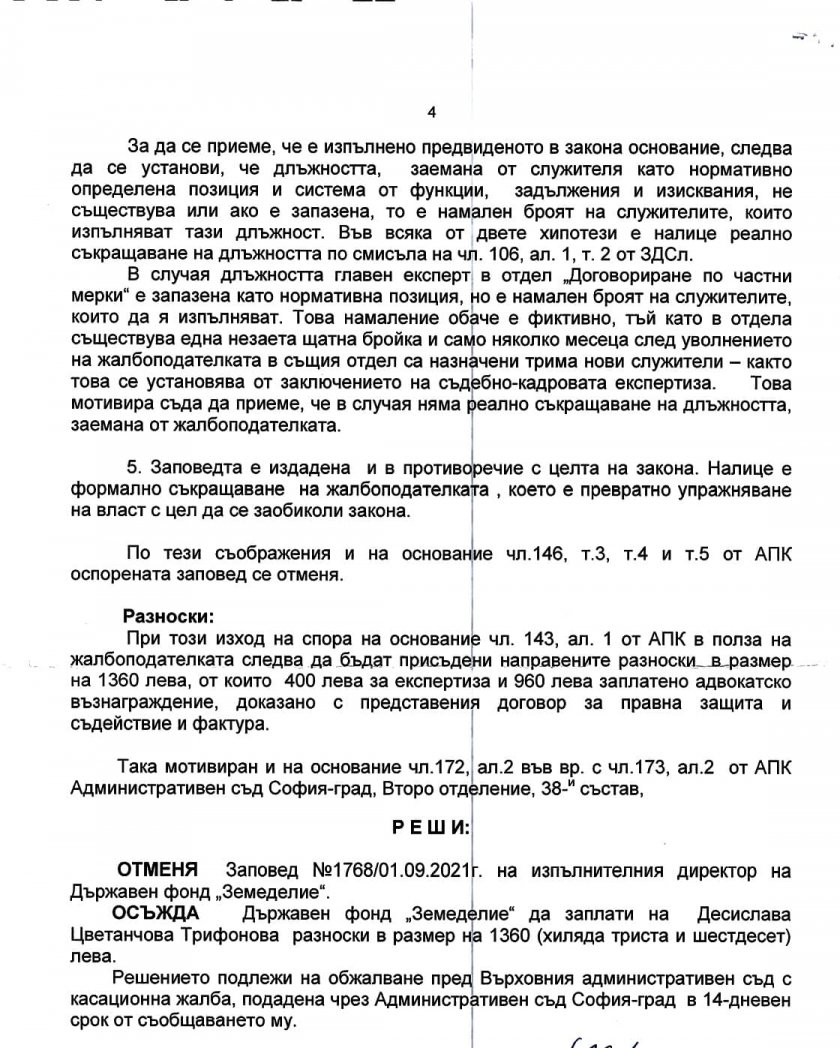 Административен съд София-град на 09.01.2023 година е оповестил за нелегално уволнението ми от Държавен фонд ”Земеделие ” на 01.09.2021 година. Това заяви депутатката от ГЕРБ Десислава Трифонова във фейсбук профила си.