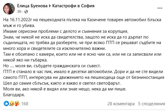 Адвокат на близки на погубен на пешеходна пътека мъж преди 2 години алармира, че от 2022 година до момента делото се влачи без необикновен триумф и се съмнява, че магистратите са корумпирани. Елица Буенова разгласява пост в групата " Катастрофи в София " във Facebook, в който споделя за черния 16 ноември 2022 г в Казичене и моли за помощ очевидци на случая да се свържат с нея и да дадат своите показания. Според тогавашната информация, мъжът е блъснат от камион до момента в който е пресичал на червен светофар. Въпреки многоброните камери ва региона обаче, това не е потвърдено. Ето каво написа адвокатката: