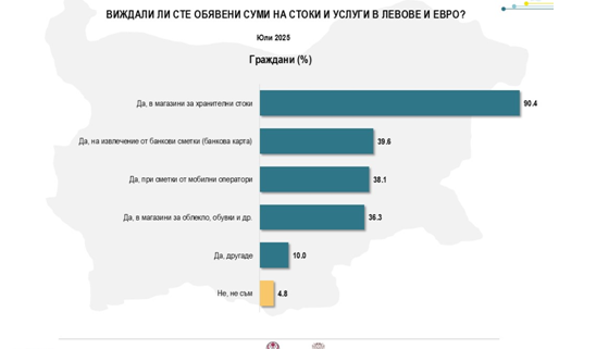 Макар двойното обозначаване на цените в лв. и в евро да е въведено всеобщо относително неотдавна, болшинството от българите към този момент са се сблъсквали с него. 90% са виждали двойните обозначения в магазините за хранителни артикули, 38-40 на 100 в извлечения от банкови сметки и мобилни оператори, 36% - в магазини за облекло и обувки. Първите съприкосновения разумно провокират спорни оценки, защото привикването към новата валута изисква време. В този смисъл е доста значимо, че двойното означение стартира по-рано. Към момента, самооценките на хората се разделят на две съвсем равни елементи – 34% настояват, че то ги улеснява, стартират да привикват. 36% признават, че двойното означение по-скоро ги обърква – най-често оповестяват, че се подвеждат по по-ниската цена, която е в евро.