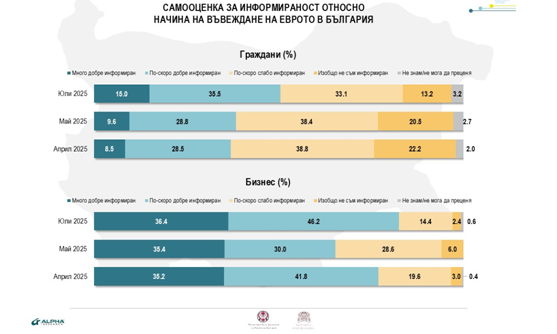 Националното представително изследване записва стабилизиране на поддръжката за присъединението на България към еврозоната. При жителите съотношението е 49.2%: 45.8% (ръст от 3 процентни пункта по отношение на май), а бизнесът резервира стабилно високи позитивни настройки (69%: 30%). Обобщаващата оценка и на двете целеви групи е, че в случай че България одобри еврото от 1 януари 2026 година, това ще е триумф за страната ни в цялостната ѝ евроинтеграция . 43% от необятната общност и 62% от представителите на бизнеса споделят тази оценка.