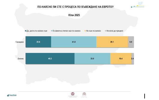 Яснота на процеса – През юли изследването включва знак и за полезността на добитата информация. 23.6% от жителите и 45% от бизнеса настояват, че към този момент са много по-наясно с процеса по въвеждане на еврото, 41.8% от първата група и 33% от втората – " в известна степен са по-наясно ". Между 21 и 29 на 100 от интервюираните признават, че към момента не могат да се ориентират добре.