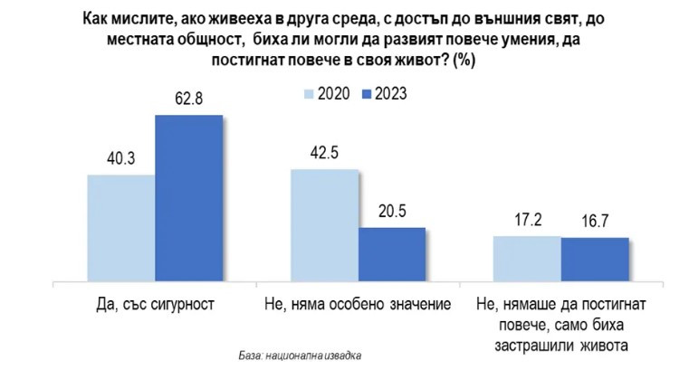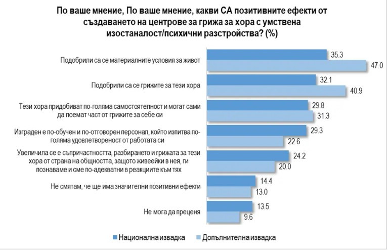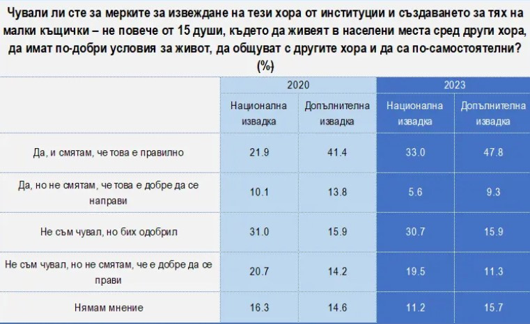 Основните провокации пред процеса на деинституционализация съгласно извършено социологическо изследване от организация „ Алфа Рисърч “ по отношение на „ Нагласите на обществото към хората с умствена назадничавост и с психологични разстройства “ през 2023 година са няколко. Към сегашния миг обществото вижда три съществени позитива от процеса: по-добри материални условия, по-добра грижа, повече автономия. Същевременно, необходимо условие за триумф на процеса, е обезпечаването на задоволителен като брой, добре мотивиран и подготвен личен състав, който да се грижи за хората с тези проблеми. Постепенно нарастват запознатостта и позитивното отношение към ограниченията по деинституционализация на хората с умствена назадничавост и психологични разстройства. На национално равнище нарастват от 22% през 2020 година на 33% през 2023 година Сред локалните общности запознатостта и утвърждението нарастват от 41% до 48%, т.е. вече съвсем всеки втори знае и утвърждава процеса. Важно е да се означи, че локалните общности от обитаемоте места, в които към този момент са разкрити нови услуги, реагират положително – без значение дали са осведомени или не с ограниченията, поддръжката за тях съществено господства над неодобрението (63%:21%). Малко по-скептична остава необятната общност, само че и там утвърждението надвишава неодобрението (53:31%). Все още забележителна част от обществото е по-скоро пасивна и гледаща в профил с известно състрадание, само че без предпочитание да се ангажира и да разбере в дълбочина проблемите и същността на хората с такива проблеми. За да бъде преодоляна стигмата, която към момента тегне над тях, те би трябвало да бъдат забележими с персонални истории, които демонстрират позитивно развиване за тях в резултат на новия вид грижа.