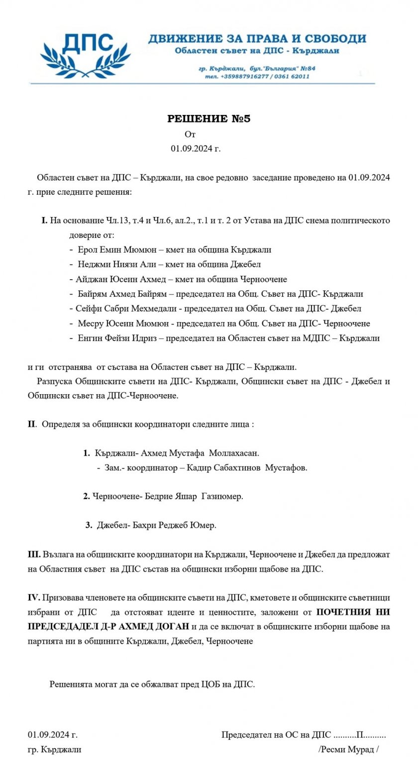 На свое постоянно съвещание на 1 септември Областният съвет на Движение за права и свободи – Кърджали приема няколко основни решения. Партията взима решение да снеме политическото доверие от Ерол Мюмюн, Неджми Али, Айджан Ахмед, Байрям Байрям, Сейфи Мехмедали, Мееру Мюмюн, Енгин Идриз.