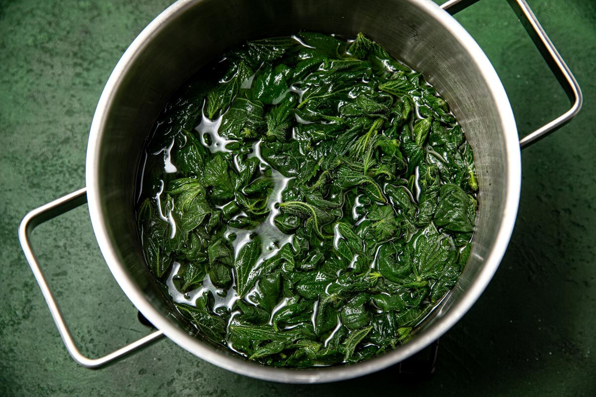 Изпарете ги с вряла вода и ги сварете в подсолена вода за към 3 минути, с цел да станат листата на копривата меки и да не бодат.