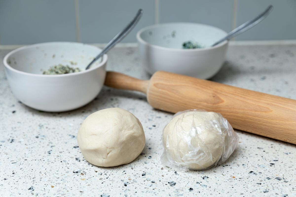 Юлия Мулино Разделете тестото на две елементи. Работейки с едната част, увийте втората част в торбичка, с цел да не изсъхне тестото.