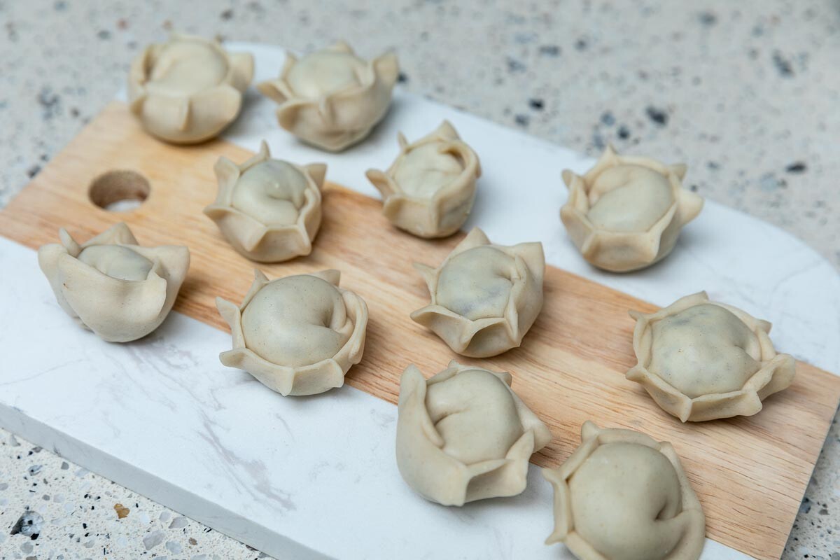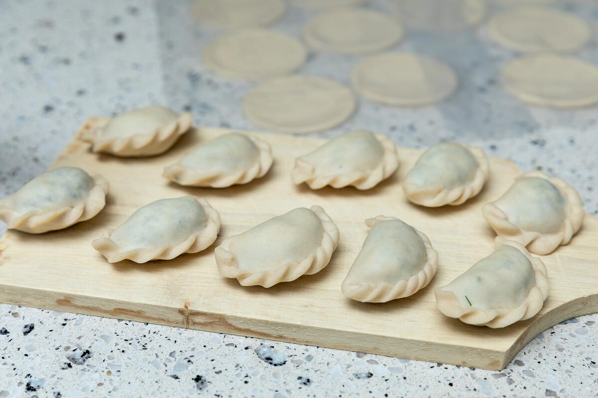 Юлия Мулино Разточете слой с дебелина един милиметър и направете кръгове с диаметър 5 см. От един слой получих към 35 кнедли.