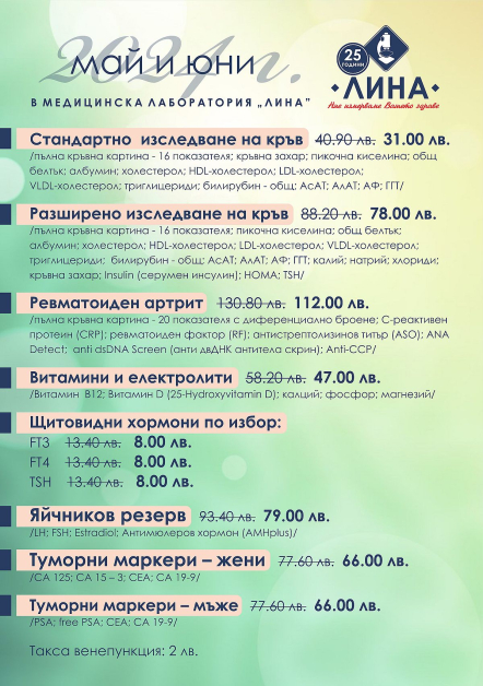 Ако имате потребност от цялостни кръвни проучвания, „ ЛИНА ” е вярната лаборатория. През месеците май и юни 2024 година тя организира 8 профилактични акции с разбори на налични цени, които важат в независимите ѝ филиали в:, и. Предварително записване на час или направление от доктор НЕ са нужни. Препоръчително е преди да посетите лабораторията, да прочетете каква е подготовката за другите проучвания. Таксата операция при взимане на проба е 2 лева