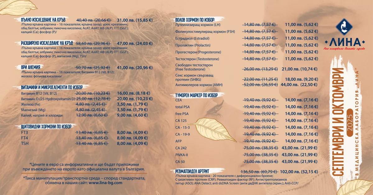 Ако имате потребност от профилактични проучвания, „ ЛИНА “ е най-подходящата лаборатория за това. През септември и октомври 2025 година можете да избирате от 8 пакета на специфични цени – от цялостно проучване на кръв до витамини, полови хормони, разбори за ревматоиден артрит и други
