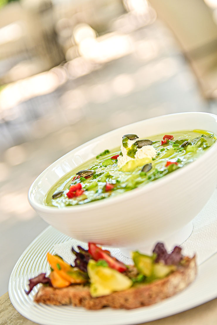 Можете да поръчате от QR код менюто напряко от шезлонга. Тук има нещо свежо за всеки усет и час. Студената чорба с авокадо и краставица е отличен избор, както и богатата салата „ Витамина “.