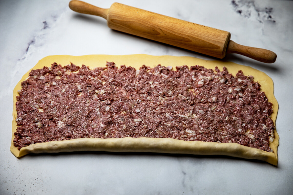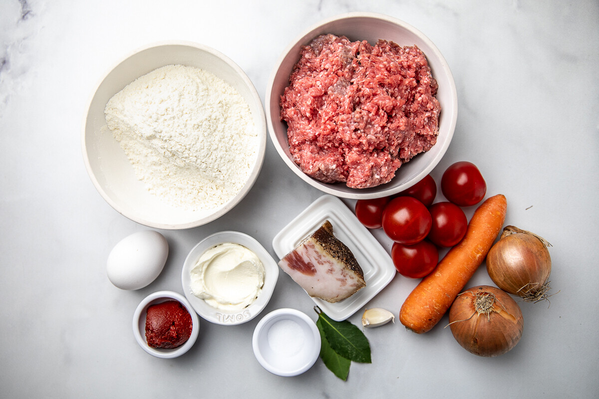 Брашно – 170 гЯйце – 1 яйцеВода – 2-3 с.л.Сол – 1 ч.л.За плънката:Смесена плънка (говеждо и свинско месо) – 250 гБекон или пушен свински стомах – 40 гЛук – 1 бр.Сол и черен пипер на усет