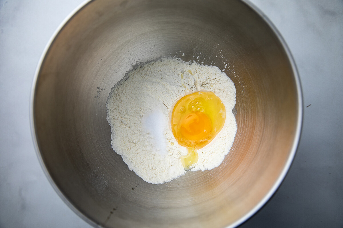 Сложете брашното, солта, яйцето и две лъжици вода в купа и замесете тестото на ръка или с миксер. Ако е належащо, прибавете трета лъжица вода. За по-голяма разтегливост меся тестото с миксер в продължение на 15 минути.