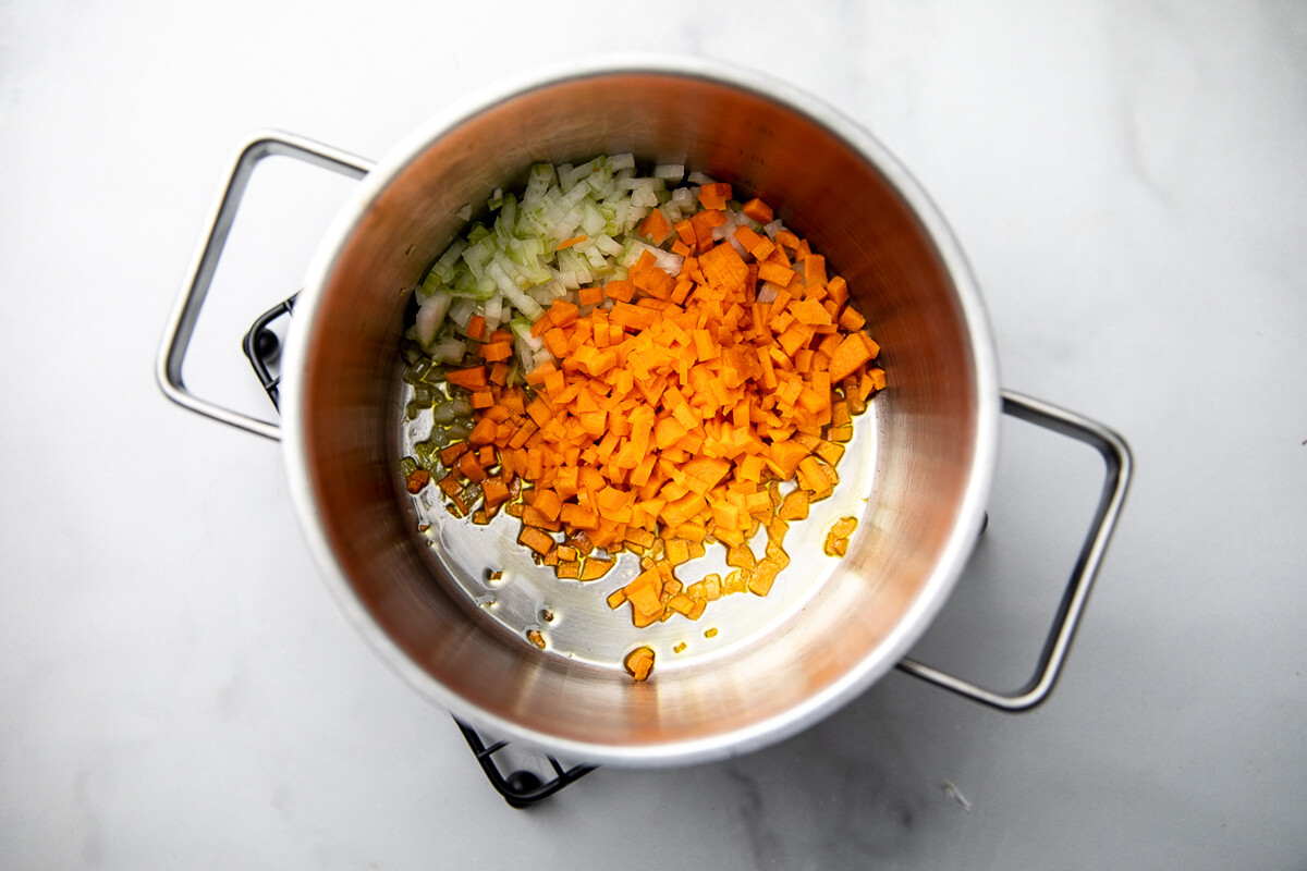 Докато тестото се меси, пригответе соса. Нарежете лука и морковите на ситно и ги запържете в растително масло.