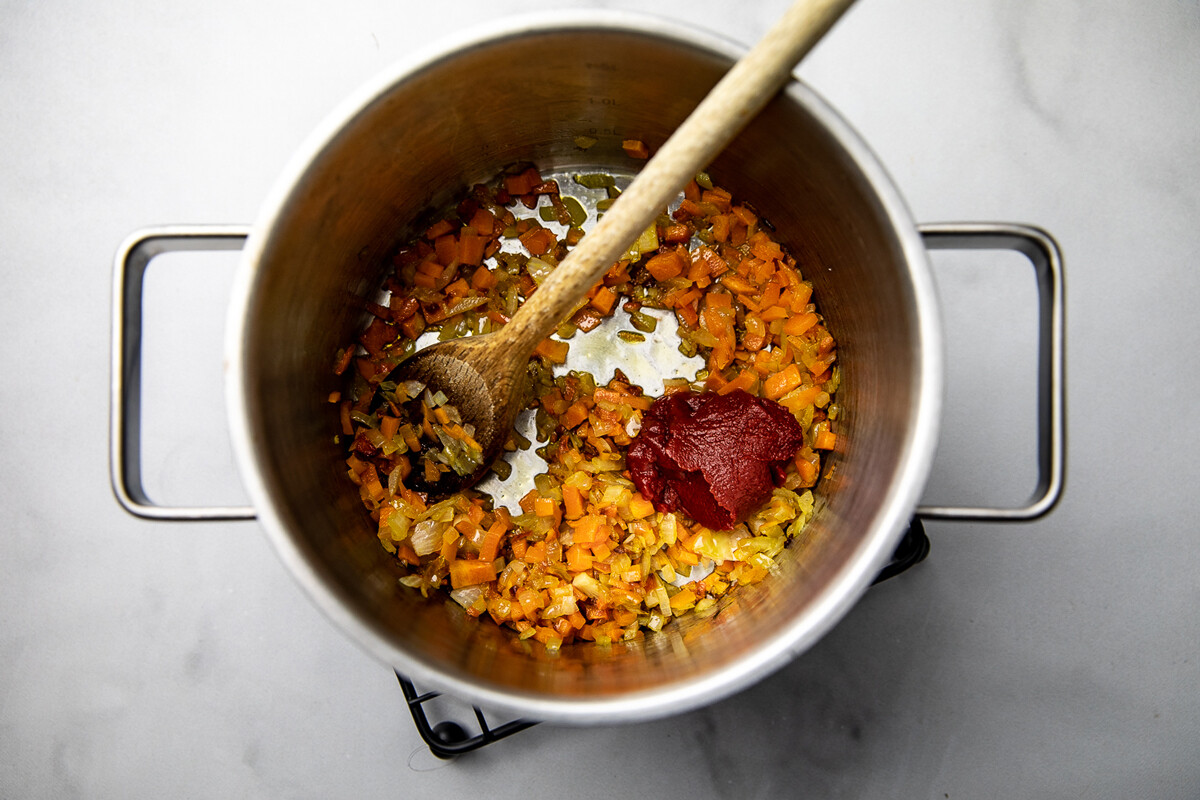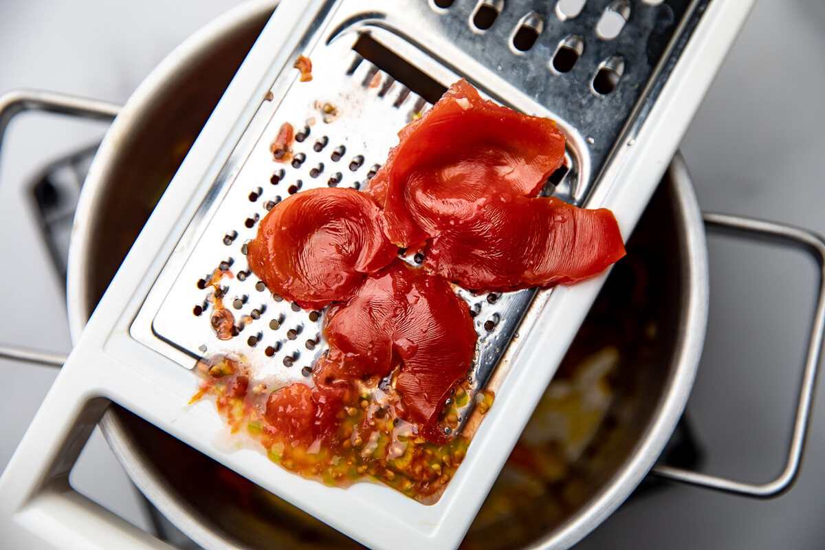 Юлия Мулино Добавете наситнените домати. Най-бързият метод е да ги настържете над тигана – кожата остава от горната страна на рендето.