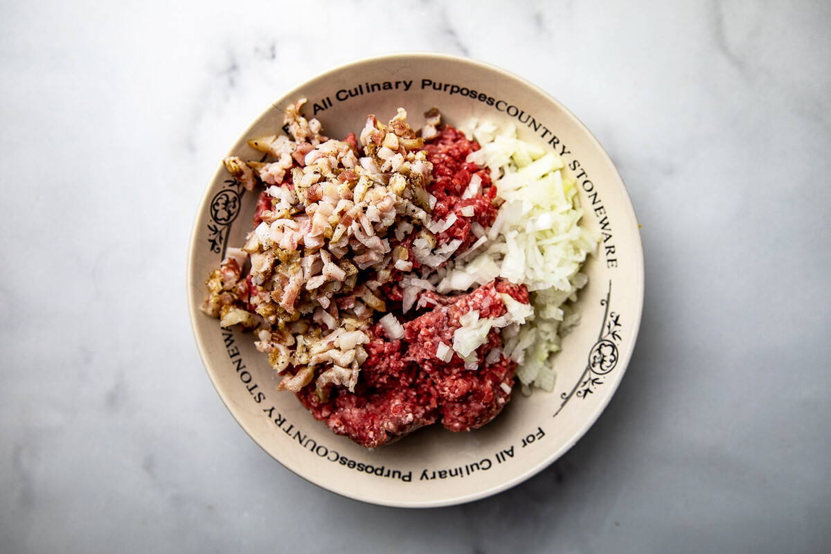 Юлия Мулино Сложете всички съставки в месомелачката. Опитах се да нарежа сланината и лука на ситно с нож, както се правеше едно време.