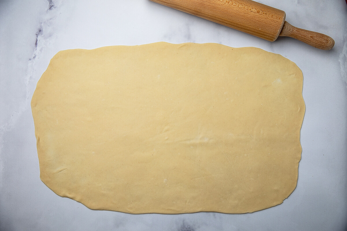 Разточете тестото на правоъгълен слой с дебелина 1,5 мм.