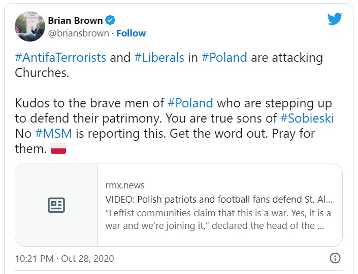 Подобни премеждия могат да бъдат открити даже в Съединени американски щати, където ще открием по този начин наречения Световен конгрес на Семействата, където се вършат най-различни интернационалните срещи, само че по някаква магическа причина се популяризират и доста забавни подправени вести от хора като Браян Браун, един от авторитетните фрагменти на интернационалното дясно придвижване. Той продължава да е прочут със своите крайни изявления, в това число и изказванието, че терористите от Антифа и либералите в Полша са нападали църкви.