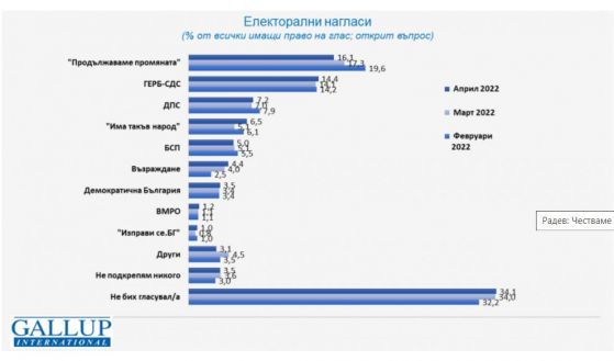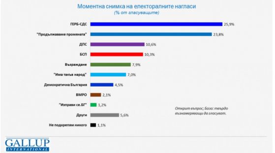 Ако изборите бяха в средата на април, още веднъж щеше да се случи оспорвана борба сред двете основни обединения в страната, регистрират социолозите от " Галъп интернешънъл болкан ". Сред главните играчи обаче този път щеше да бъде и „ Възраждане “, която е и единствената групировка, която продължава да отбелязва растеж разясняват от организацията.