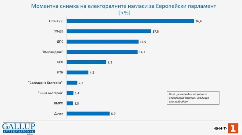 Данните са от сондаж на „ Галъп интернешънъл болкан “, изработен за Българската национална телевизия. Сондажът не е прогноза за избирателен резултат, а е моментна фотография на настройките в миналите неотдавна в България празници.