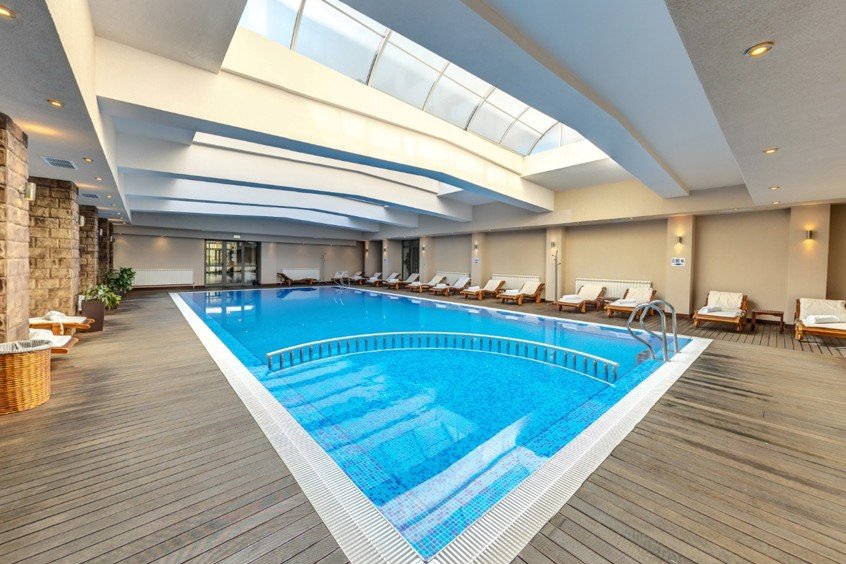 Очаквано, хотелът предлага целогодишен вътрешен басейн с минерална вода и полуолимпийски размери, детски басейн и детска водна пързалка. А наред с всичко това и джакузи, открит сезонен басейн с минерална вода и детски басейн, освежен типичен ресторант с лятна градина с аспект към открития басейн.