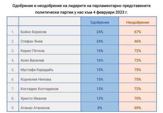 В началото на февруари Корнелия Нинова и Мустафа Карадайъ имат съизмерими рейтинги на утвърждение и на отрицание. Одобрявани са от по 15% от българите, а неодобрението им възлиза на по 75%. Нинова е подкрепяна от 94% от гласоподавателите на Българска социалистическа партия, а Карадайъ – от 92% от гласоподавателите на Движение за права и свободи, допълват от " Екзакта ".
