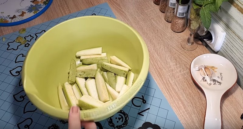 Нарежете тиквичките на кубчета с дължина 5 см, посолете, прибавете растително масло.