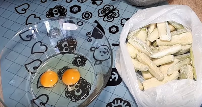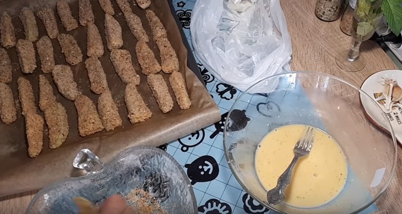 Потопете тиквичките в яйцето едно по едно, след което оваляйте добре в галета.