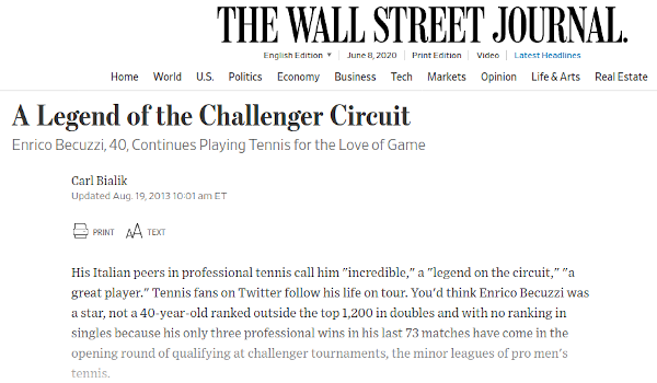 Дори известният американски бизнес ежедневник Wall Street Journal още преди години обръща внимание на Енрико Бекуци и му посвещава публикация, озаглавена " Една легенда на веригата Чалънджър ". Тогава италианецът е на 40-години, а през днешния ден нещата не са се трансформирали кой знае какъв брой за тенис мечтателя.