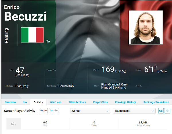 Ако Роджър Федерер, Рафаел Надал и Новак Джокович са най-успешните тенисисти в историята на професионалния тенис, то Енрико Бекуци е на другия полюс. 47-годишният италианец е не просто доста, доста надалеч от триумфите на тенис звездите, той даже не може да завоюва мач от главната скица на шампионат от другите равнища на професионалния тенис.