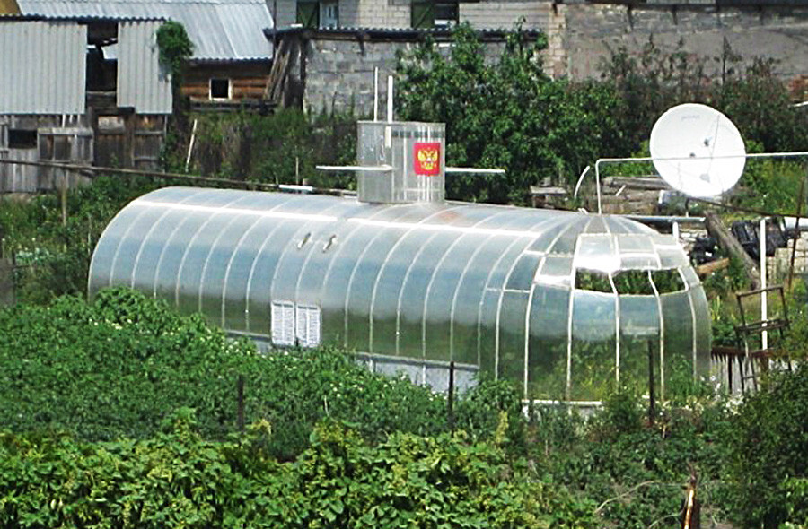 Истинската фантазия на всеки виладжия-подводничар! Парник за краставици във формата на подводница се появи на един вилен сектор в подмосковското населено място Егориевско. Вилата е направена по поръчка на стопанина ѝ.
