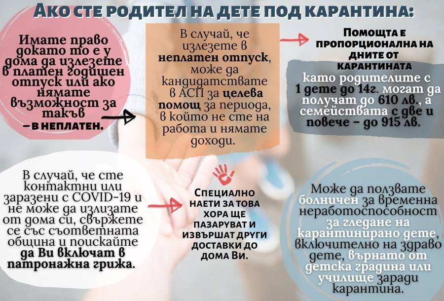 Помощта е пропорционална на дните от карантината, като родителите с 1 дете до 14г. могат да получат до 610 лева, а фамилиите с две и повече – до 915 лева
