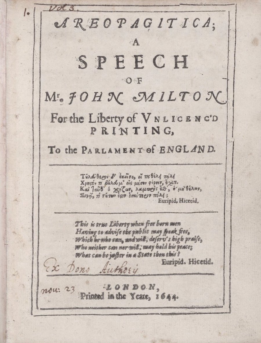 Ако в британската литература фигурата на Джон Милтън (1608 ~ 1674), създател на „ Изгубеният Рай “, е съпоставима единствено с тази на Шекспир, то с „ Ареопагитика “ (1644), с речта си в отбрана на свободното слово, той е считан за Шекспир в публицистиката. Фредерик Хънт твърди, че точно „ Ареопагитика ” открива тематиката за битката с цензурата. А съгласно една записка на Гор Видал за Първата корекция към Американската конституция Милтън в действителност „ би споделил всичко това по-добре ”, само че в последна сметка „ би утвърдил същите положения ”.