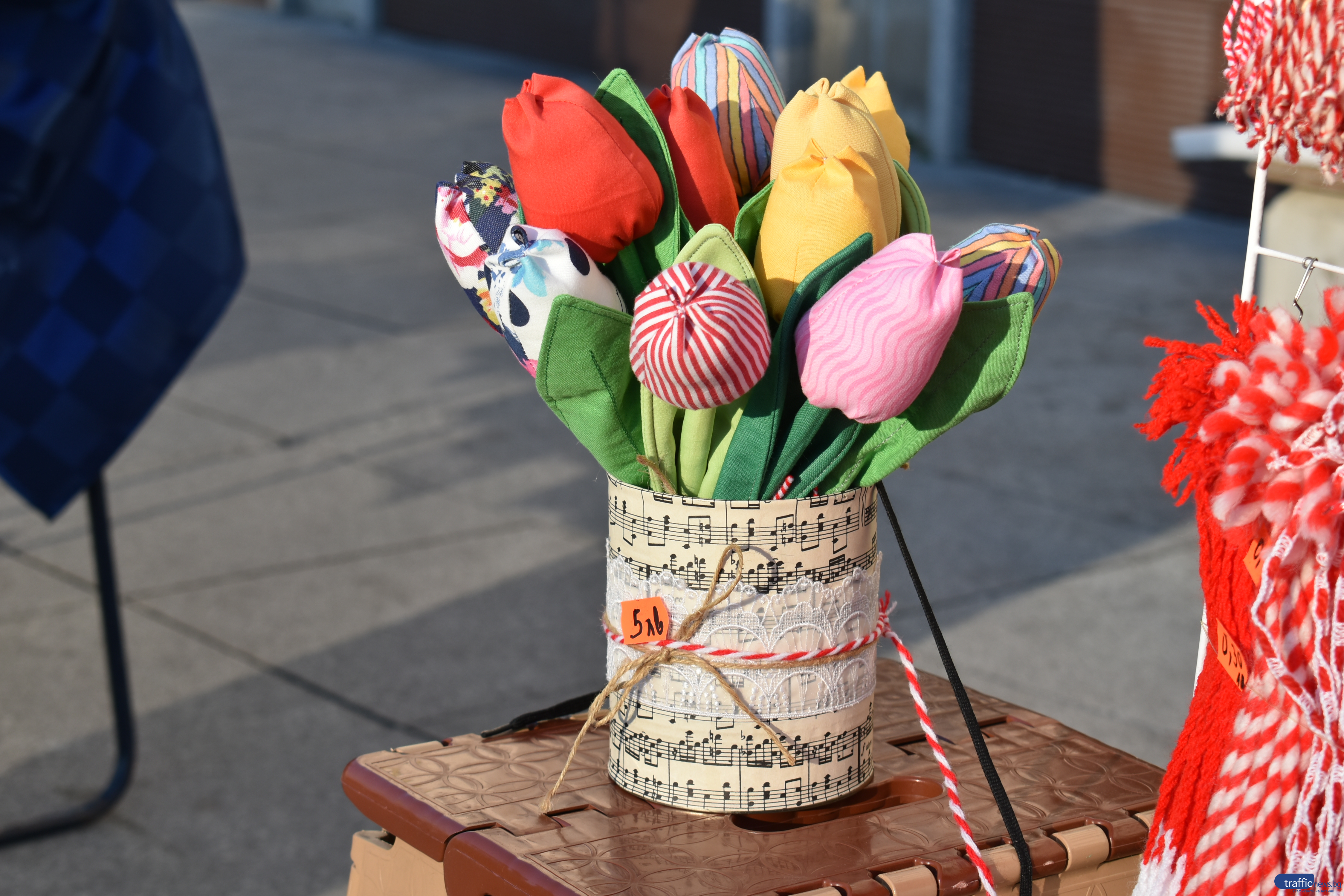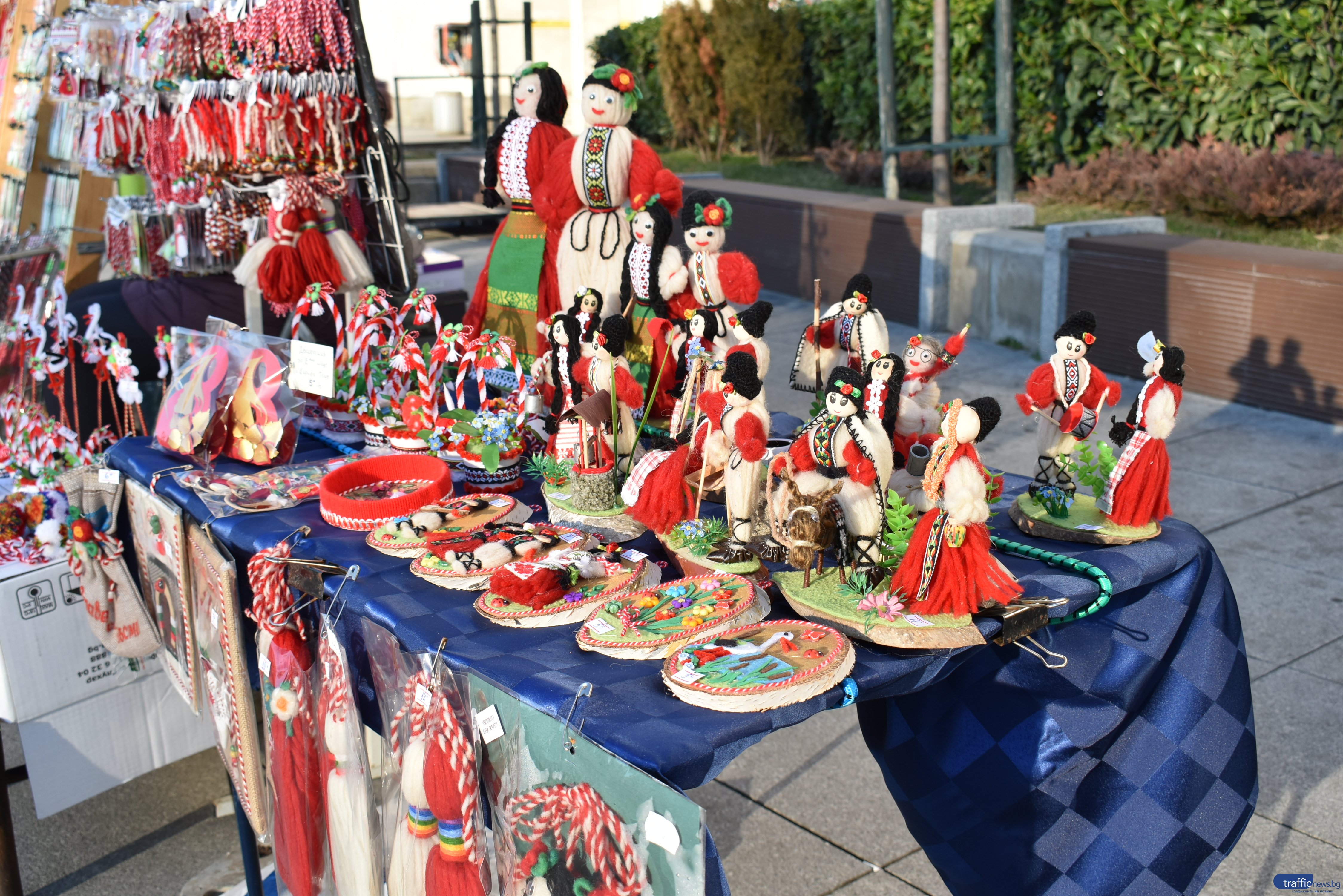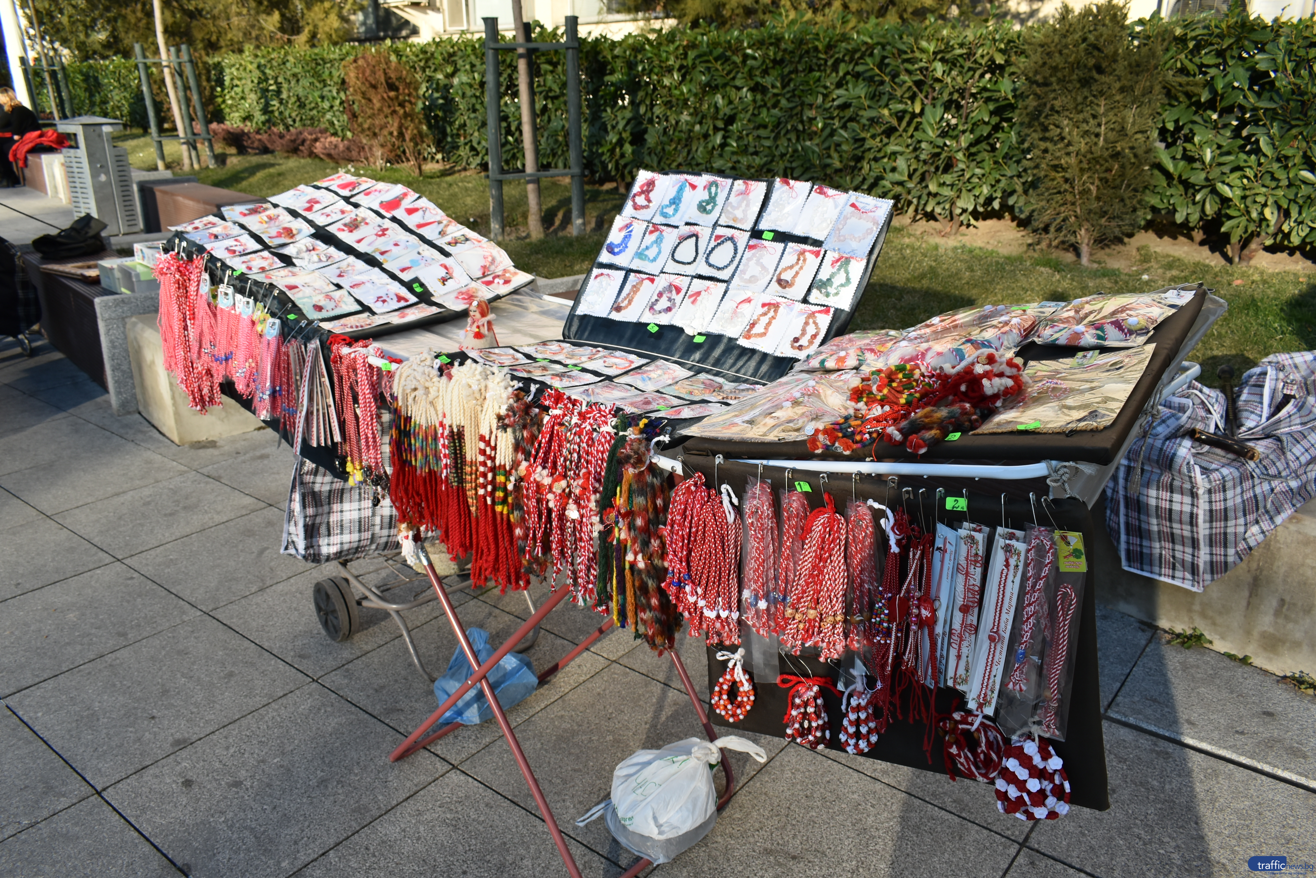 Срещам я на един от щандовете пред Централната поща – обичайното сборище на търговци на мартенички в Пловдив. Предпочита да остане в сянката на плетивата си и отхвърля да показа името си. Може би поради това беседва по този начин живо с клиентите си, посреща и изпраща с усмивка тези, които са спрели да прегледат творбите ѝ.