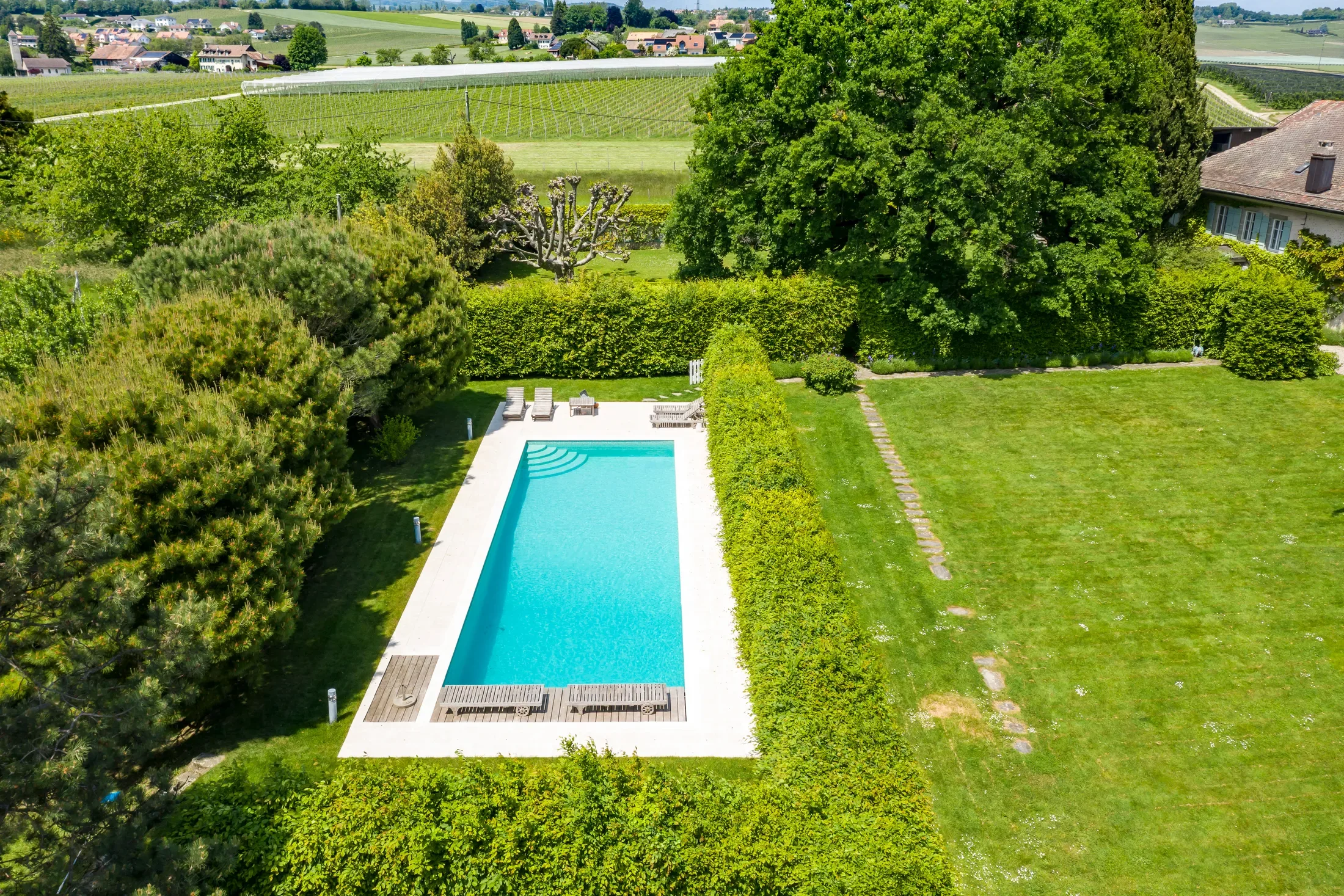 От прозорците на вилата можете да се насладите на буколичния пейзаж, в това число покрити със сняг планини и очарователна прилежаща селска къща, която наподобява като изтръгната от приказка.