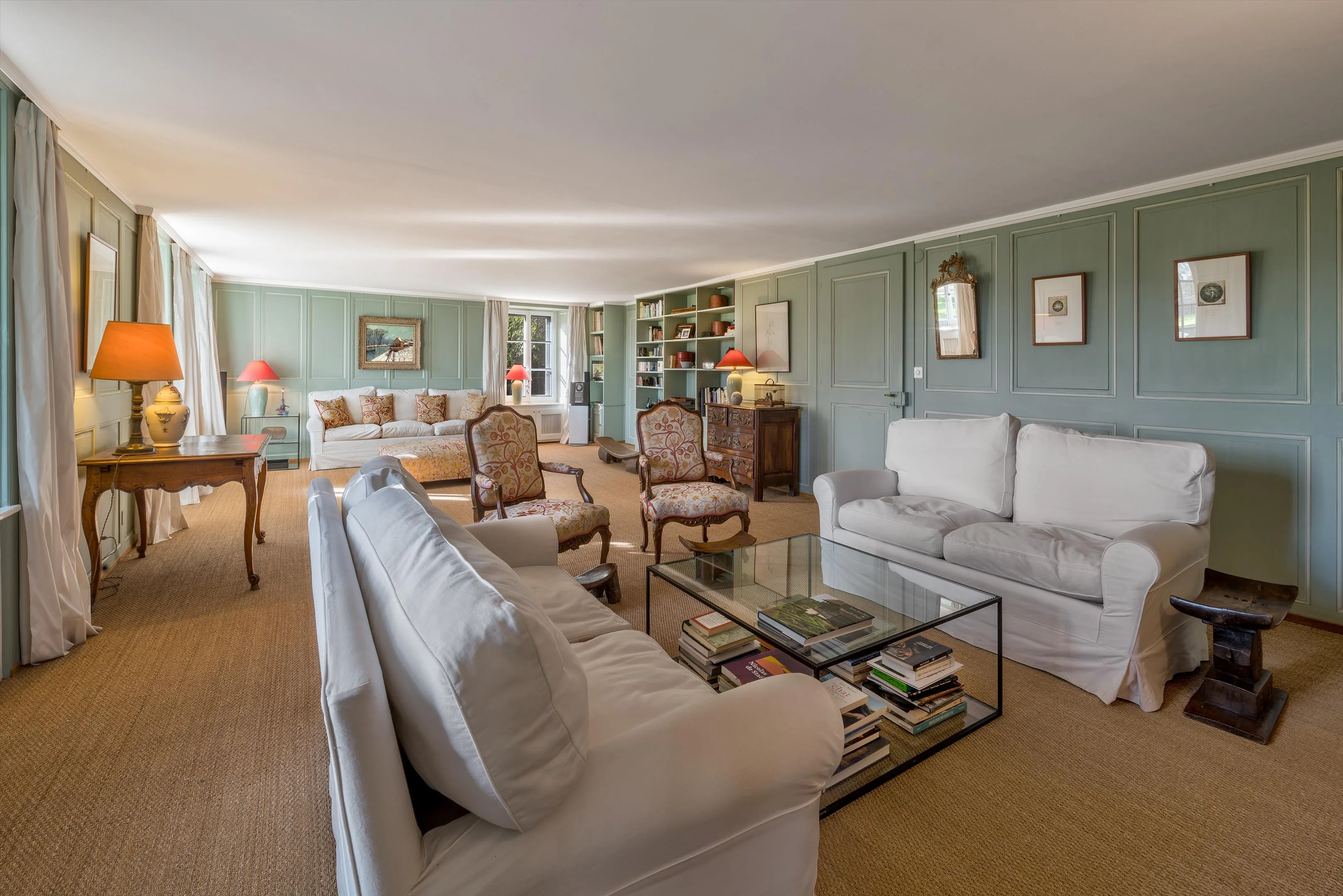 В огромната всекидневна елегантната ламперия и еклектичните мебели основават уютна, само че издигната хармония.
