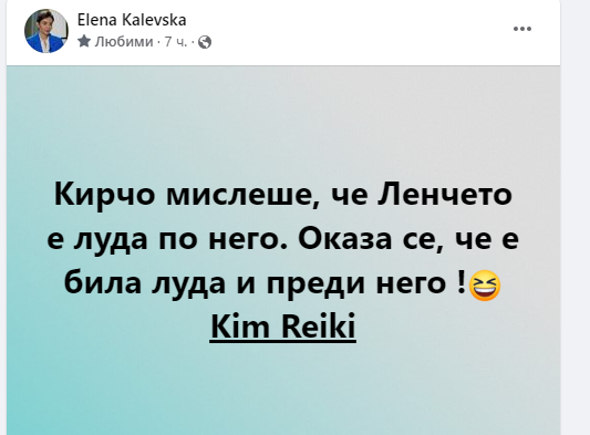 Актрисата Елен Колева реши да се посмее на гърба на Лена Бориславова и Кирил Петков. Не е ясно дали прелъстителката има зъб на някой от двамата, само че написа във фейсбук: