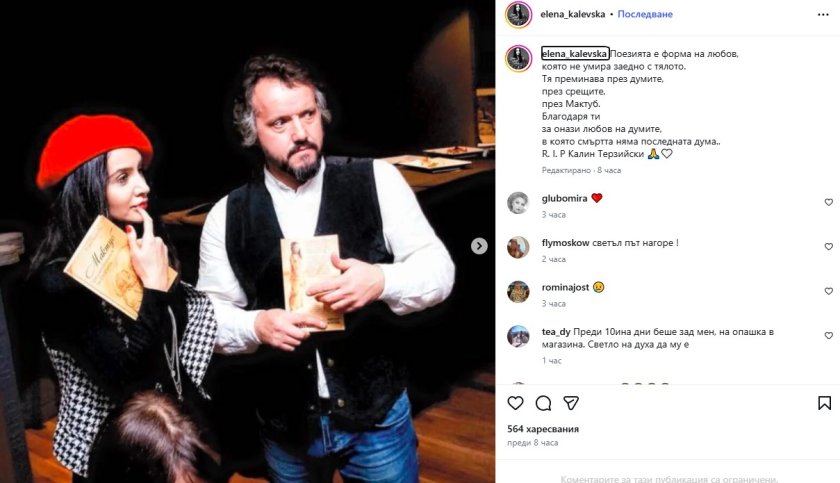 Актрисата Елен Колева се сбогува с Калин Терзийски с трогателни думи. Тя показа кадър с писателя и написа: