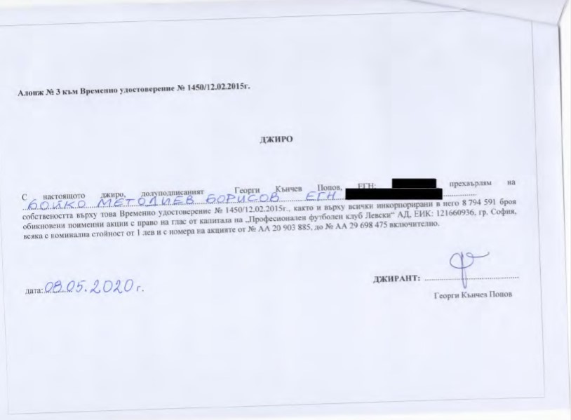 Акциите на Левски са джиросани към премиера Бойко Борисов от притежателя на " сините " Георги Попов още на 8 май. Това демонстрират документите изпратени от " Нове Холдинг " към медиите. Всички пакети акции са трансферирани още в края на предходната седмица. Това идва като противовез на упованието, че Тити Папазов ще получи книжата, както бе обявено в последните няколко дни.