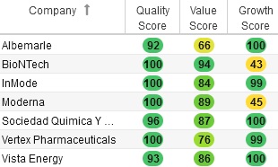 Източник: StockRoverВ таблицата нагоре е ясно, че пазарите пренебрегват производителите на медикаменти, които регистрират мощни облаги от коронавирус ваксини. Инвеститорите към момента би трябвало да печелят постоянни облаги, даже в случай че коронавирус стане публично ендемичен през идващите няколко години.Освен това производителите на литий също попадат в този лист. За тези, които имат вяра, че търсенето на литий ще се увеличи през идващото десетилетие, има редица сочни акции за закупуване тук.Albemarle (ALB)Albemarle означи съвършен резултат за напредък на StockRover. Фирмата за произвеждане на специфични химикали означи мощни чисти продажби за третото тримесечие, отчитайки растеж от 152% на годишна база до 2.1 милиарда $.Една от аргументите за този растеж е покачването на ALB акциите, което обезпечава на вложителите от световния енергиен преход. Нейният цех за превръщане на литий в Китай и разширението на Kemerton II в Австралия ще укрепят дълготрайните вероятности за напредък на компанията.Albemarle придобива Guangxi Tianyuan New Energy Materials в Qinzhou, Китай на 25 октомври тази година. Очаква се компанията да разшири активността си в бъдеще. Освен това има план в Джангдзяганг. Тъй като Китай е най-големият пазар на литий в света, Albemarle е стратегически позиционирана да доставя основния запас, защото търсенето пораства.Albemarle се възползва от невероятния напредък на сегмента на електрическите транспортни средства. Търсенето остава мощно, макар краткосрочните провокации във веригата за доставки. И въпреки всичко, откакто сезонното закъснение завърши това тримесечие, компанията чака мощен напредък през идната година.Инвеститорите в електрически автомобили би трябвало да чакат удобни държавни политики, които укрепват бранша. Веднага щом стопанската система се възвърне, продажбите на електрически автомобили ще се покачат, стимулирайки ALB акциите.BioNTech (BNTX)BioNTech има съвършен клас на акции, основно заради атрактивните основи. Производителят на имунизацията оповестява позитивни данни за клинична резултатност против Омикрон BA.4/BA.5. Компанията съобщи, че нейната ваксина против този вариант на коронавирус показва усъвършенстван имунен отговор. Освен това имунизацията провокира по-голямо нарастване на титрите на обезвреждащите антитела от предстоящото.Инвеститорите в BioNTech могат да одобряват, че търсенето на двувалентния бустер ще се усили. Сезонът на грипа е тук, което значи, че целевият пазар за пациенти, търсещи по-добра отбрана против Омикрон, ще докара до скок в настояванията за имунизацията на BioNTech.През последното тримесечие BioNTech записва внезапен спад на приходите от 43% на годишна база. Търсенето на ваксини е по-ниско спрямо предходната година. Въпреки това компанията е сключила гъвкави контракти за 2023 година Тя ще продължи да извършва тези контракти през 2023 година и по-късно. По този метод, защото разновидностите непрекъснато се развиват, BioNTech ще продължи да дава актуализации за ефикасността на имунизацията.Правителствата на всички места биха могли да се изправят пред риска предстоящ вид да се трансформира още веднъж в по-смъртоносна болест. Тъй като възрастните хора са изключително изложени на риск, чака се търсенето на имунизациите на компанията да остане устойчиво.Най-интересното с BNTX акциите е, че тази компания търгува при съответствие цена/печалба с ниски едноци