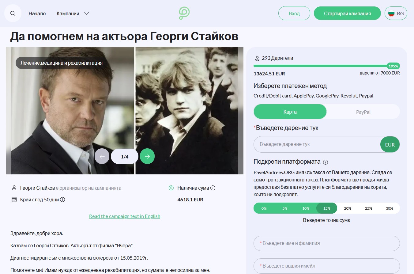 " Здравейте, положителни хора. Казвам се Георги Стайков. Актьорът от кино лентата " Вчера ". Диагностициран съм с множествена склероза от 15.05.2019 година Помогнете ми! Имам потребност от ежедневна рехабилитация, само че сумата е непостижима за мен. Затова диря помощ от вас, благи хора ", се споделя в известието на артиста. В историята на даренията се виждат няколко от по 1125 евро, а в мненията звездата написа: " Благодарение на масажите и извършената рехабилитация се усещам доста по-добре. Благодаря, съчувстващи хора! ".