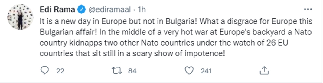 Албанският министър председател Еди Рама, който през днешния ден е в Брюксел, дружно със сръбския президент Александър Вучич и македонския министър председател Димитър Ковачевски на срещата ЕС-Западни Балкани, пусна ядосан пост в Туитър във връзка българската позиция: